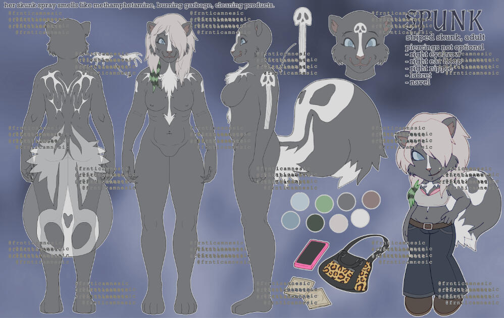 custom - $160complex reference sheets include flat colour character - front, back, side, chibi and close-up headshot with colour palette, three items, and detail close-ups.